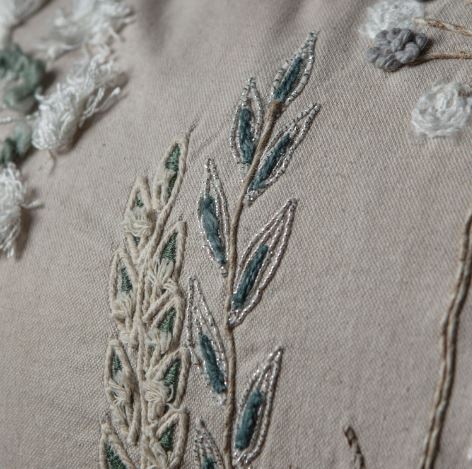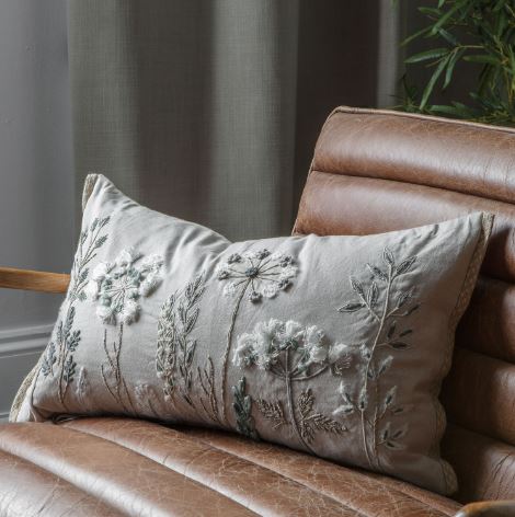 Beautifully and delicately hand embroidered floral rustic cushion, featuring a plain coordinated natural cotton reverse, knife edge with 2 braided sides and a feather filling.