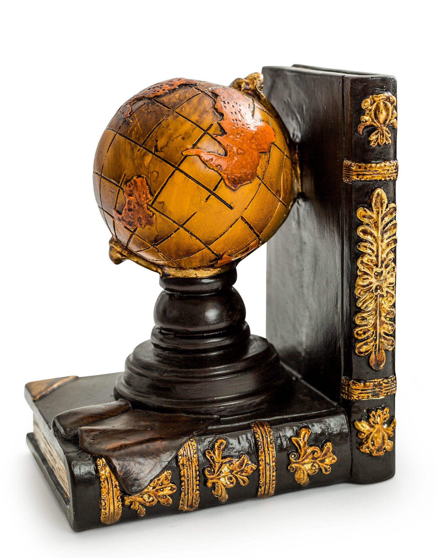 Add a touch of worldly charm to your book collection with our Antique Style Pair of Globe Bookends. Made from durable resin, these bookends feature beautifully detailed yellow globes on stands, surrounded by books. Keep your books organized and add a touch of vintage flair to your home décor.