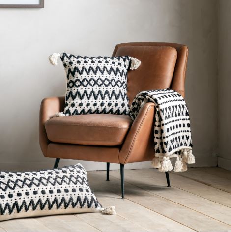 A stylish and contemporary tufted cream cushion with a beautiful black stitched Aztec design. Polyester filling.
