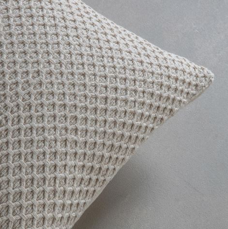 Unique ethereal style cushion with natural woven front in a subtle diamond design and natural plain cotton reverse. Features include a knife edge finish and feather filling.