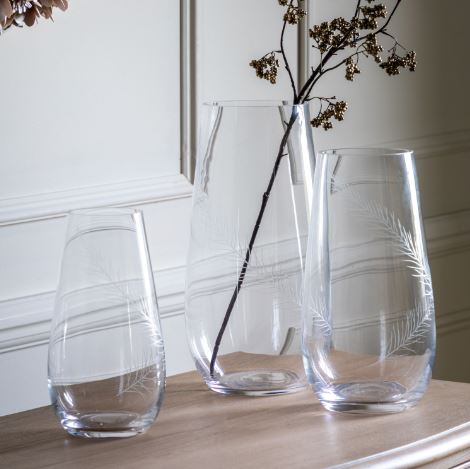 Experience elegance with this clear glass vase featuring a stunning etched feather design. Three sizes available.