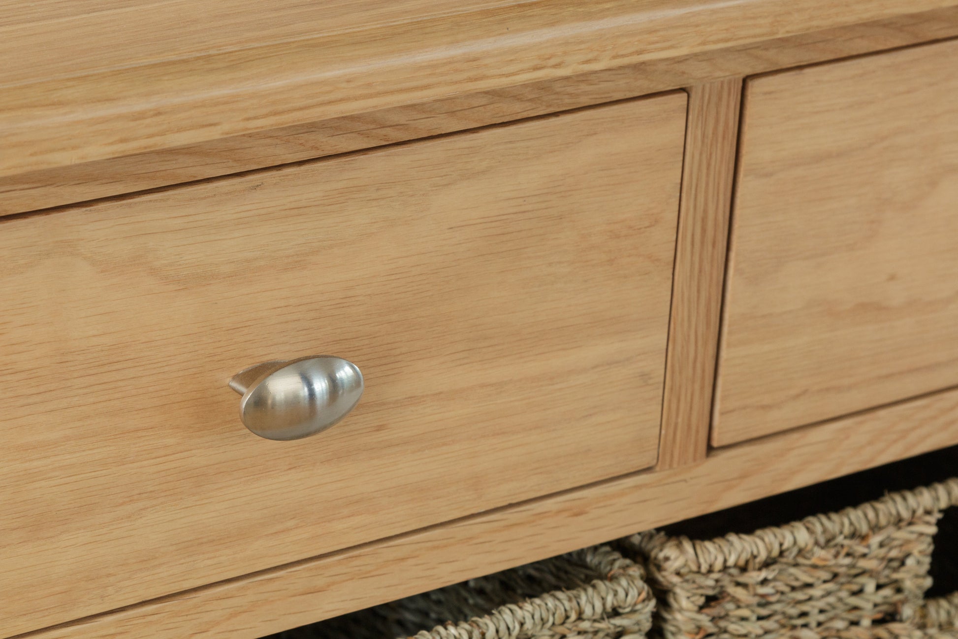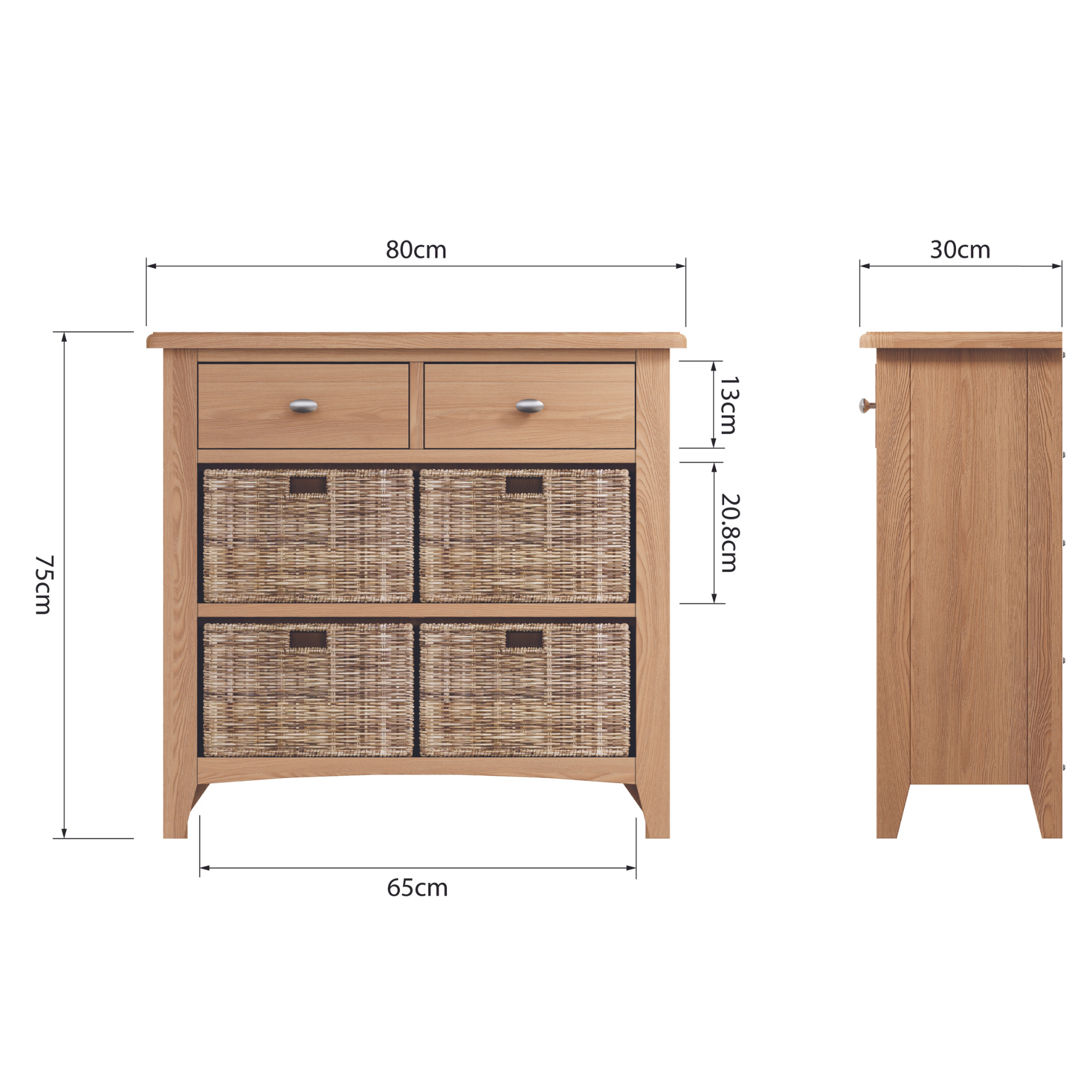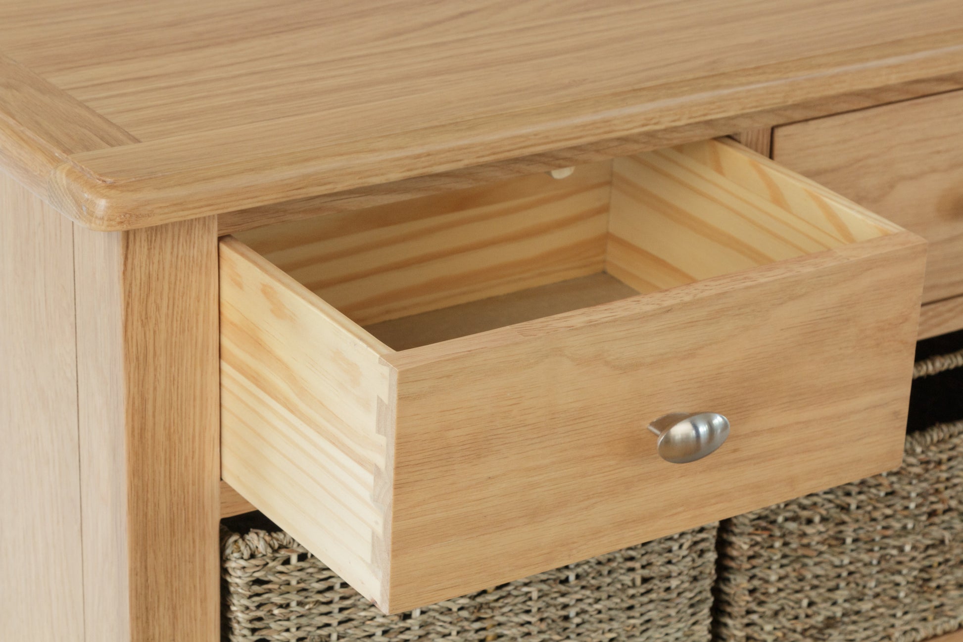 - Solid oak and oak veneer top, drawer fronts and front frame.