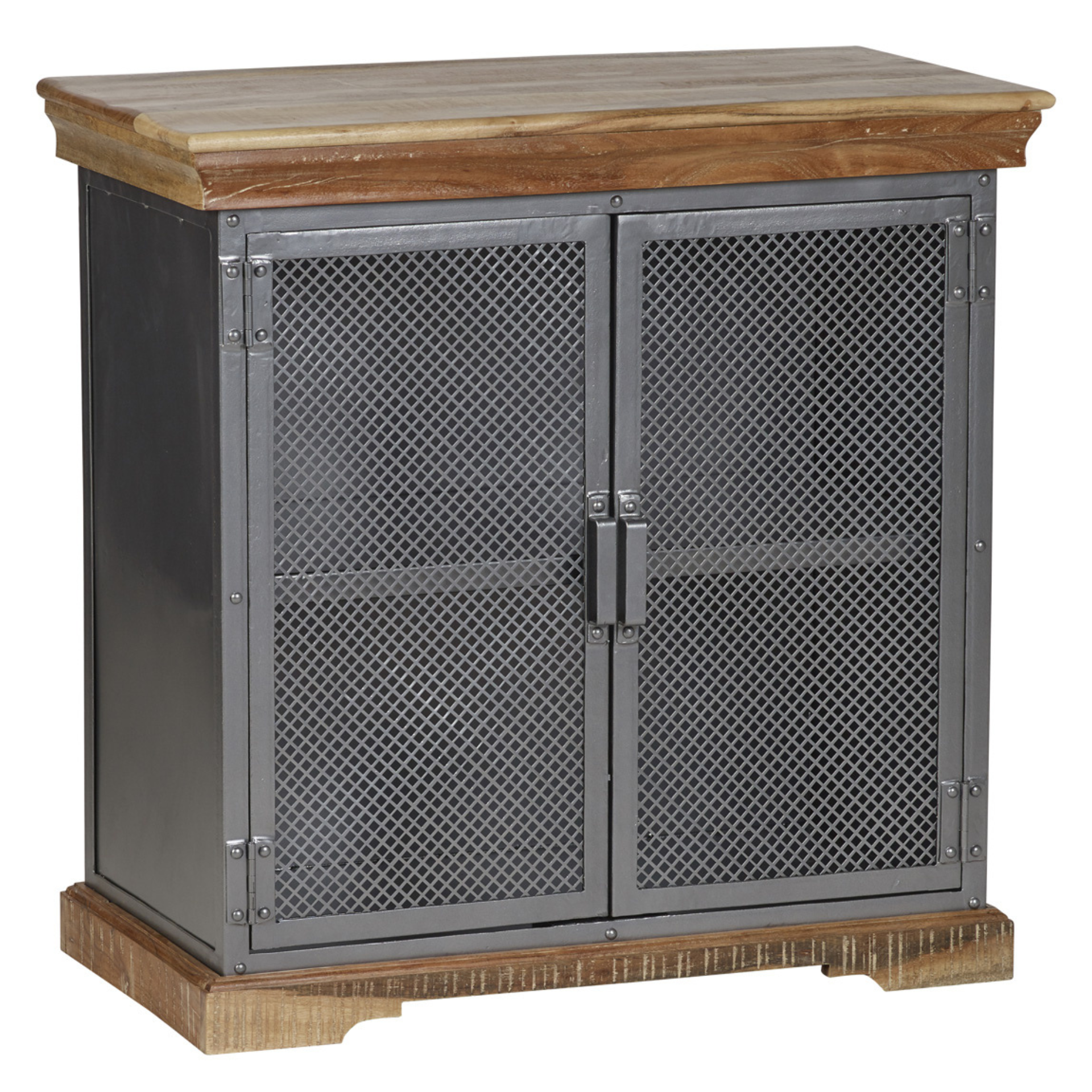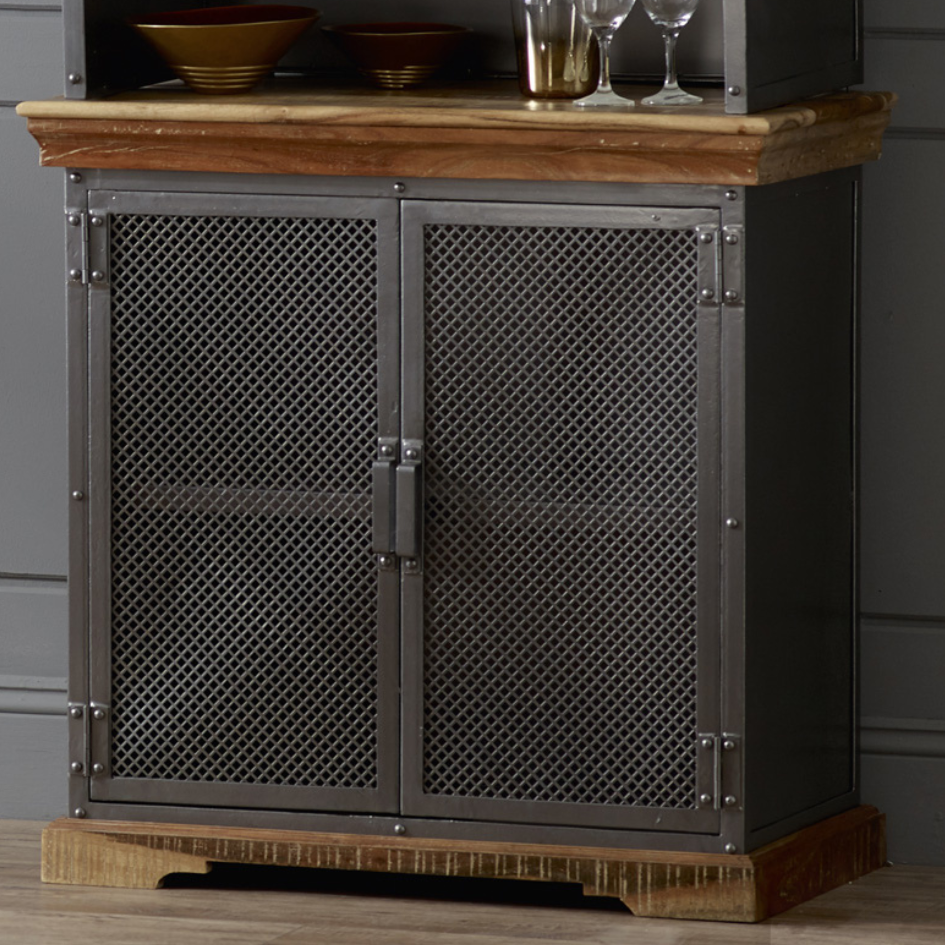 The modern solid wood and metal style furniture is created by skilled craftsmen using reclaimed metal and slightly distressed wood. The solid wood features sandblasted white stain in combination with gun metal patina applied to the metal frames, creating a very modern and versatile range. Maidstone Hutch to fit on top.