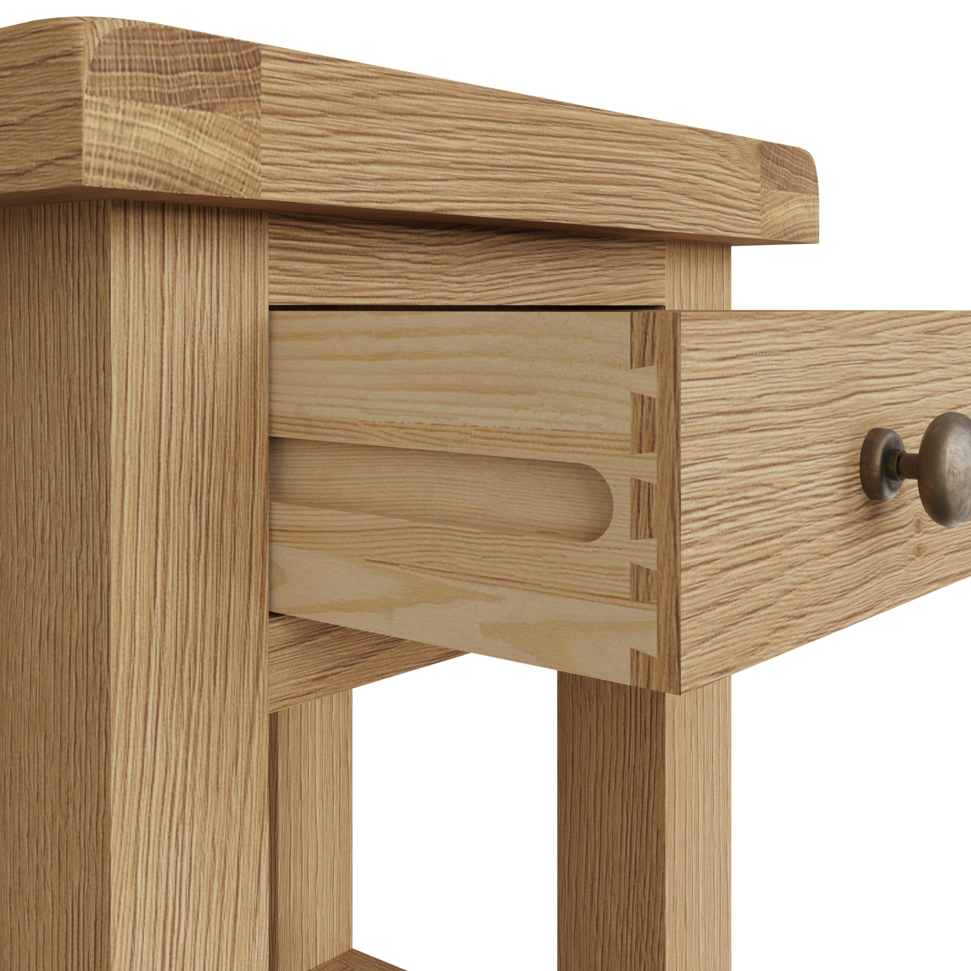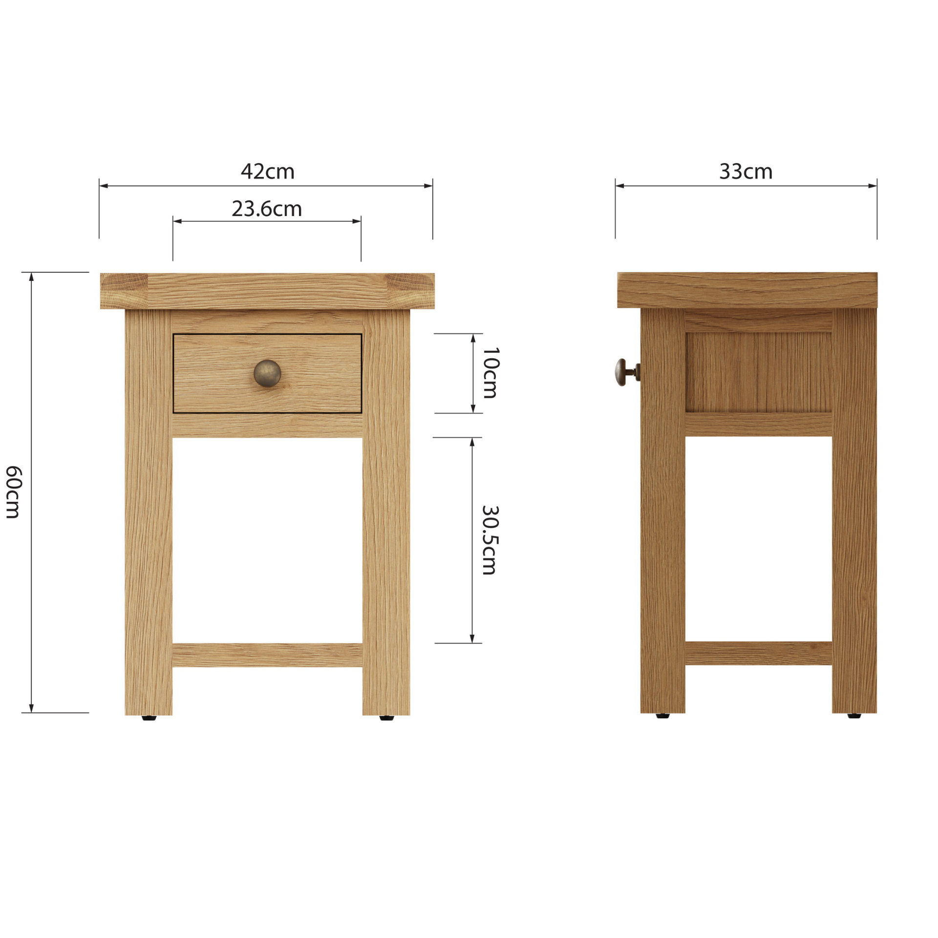 - Solid oak and oak veneer top, drawer fronts and front frame.
