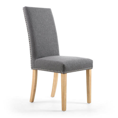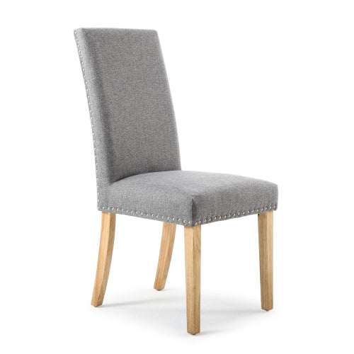 A timeless dining chair enhanced by attractive stud detailing around the edges, upholstered in steel grey or silver grey linen effect fabric. Sprung and belted seat. Available with a variety of different rubber wood legs. Prices provided are for 2 chairs. Sold in boxes of 2.