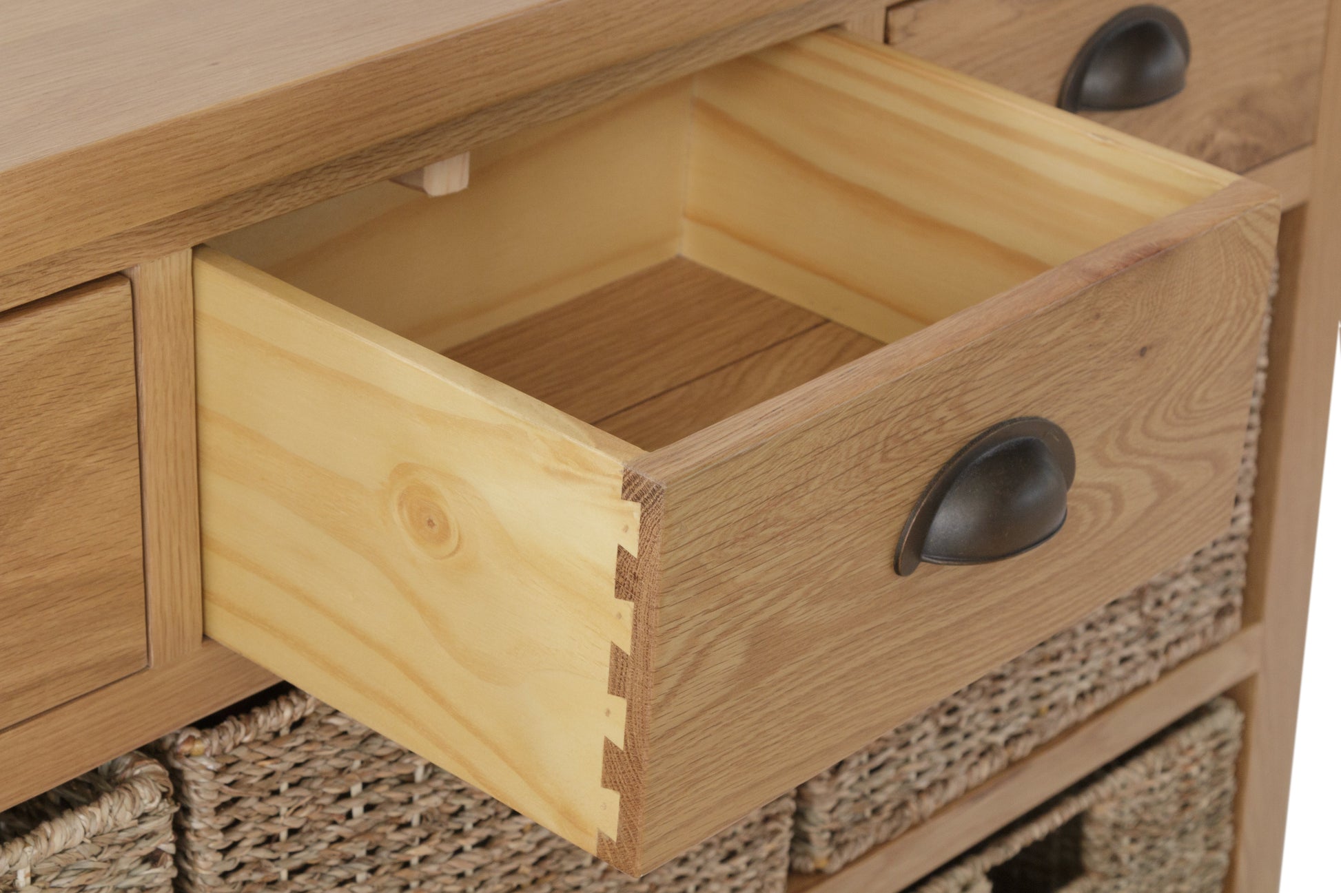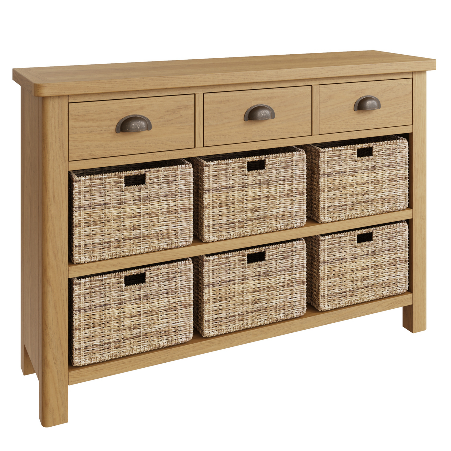 This oak collection is designed and manufactured to bring you exceptional value. The rustic oak finish with antique style cup handles and rounded corners means each item is designed to add traditional style to modern homes.